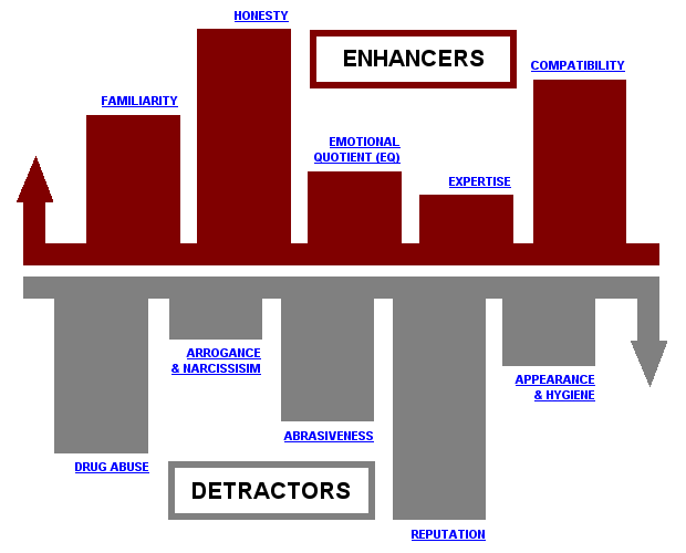 Familiarity Honesty Emotional Quotient (EQ) Expertise Compatibility Drug Abuse Arrogance & Narcissism Abrasiveness Appearance & Hygiene